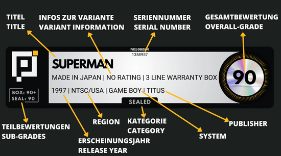 Ein weiteres wichtiges Bestandteil, neben dem Acryl-Gehäuse, ist das Label. Unser Label besteht aus hochwertigem Material und ist mit diversen Sicherheitsmerkmalen wie zum Beispiel einem selbstentwickelten Sicherheitshologramm ausgestattet. Auf dem Label findet ihr zusammengefasst alle wichtigen Informationen zum bewerteten Objekt wie den Titel, das Erscheinungsjahr, die Region und den Publisher. Weiterhin befinden sich auf dem Label die Teilbewertungen für die einzelnen Bestandteile, sowie die daraus resultierende Gesamtbewertung. Den Zustand des Objekts könnt ihr ebenfalls auf dem Label ablesen. Mit einer individuellen, fest zu dem bewerteten Objekt zugewiesenen Seriennummer, welche ihr auch auf dem Label findet, könnt ihr Online weitere Informationen zu dem bewerteten Objekt abrufen.
